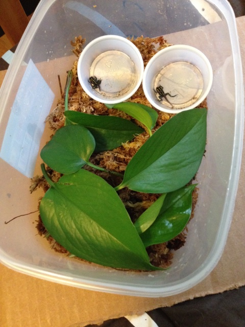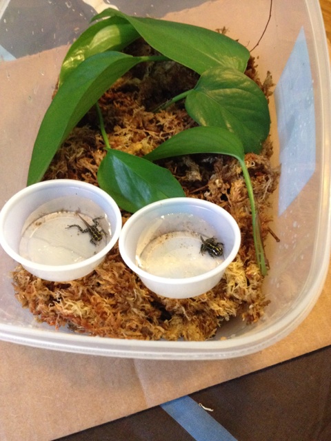 Here they both are in their new temporary tank. I will leave them in here for a couple of weeks or until I see them eating flies and gaining some weight and then I will move them in with my lone baby from the batch last year.