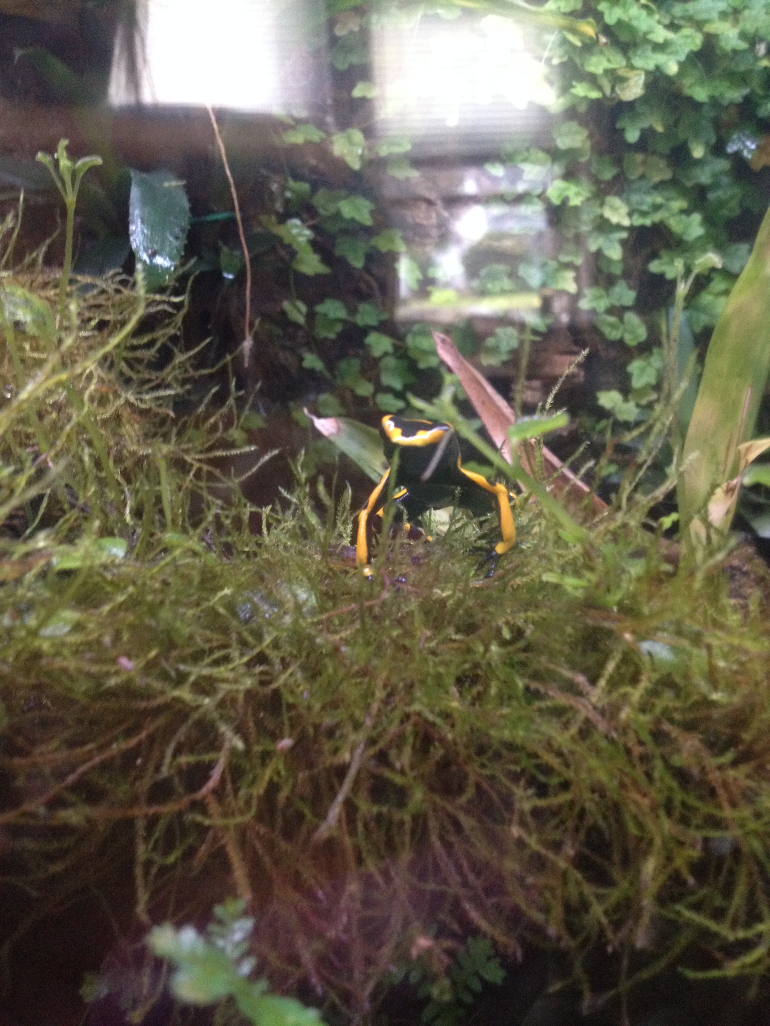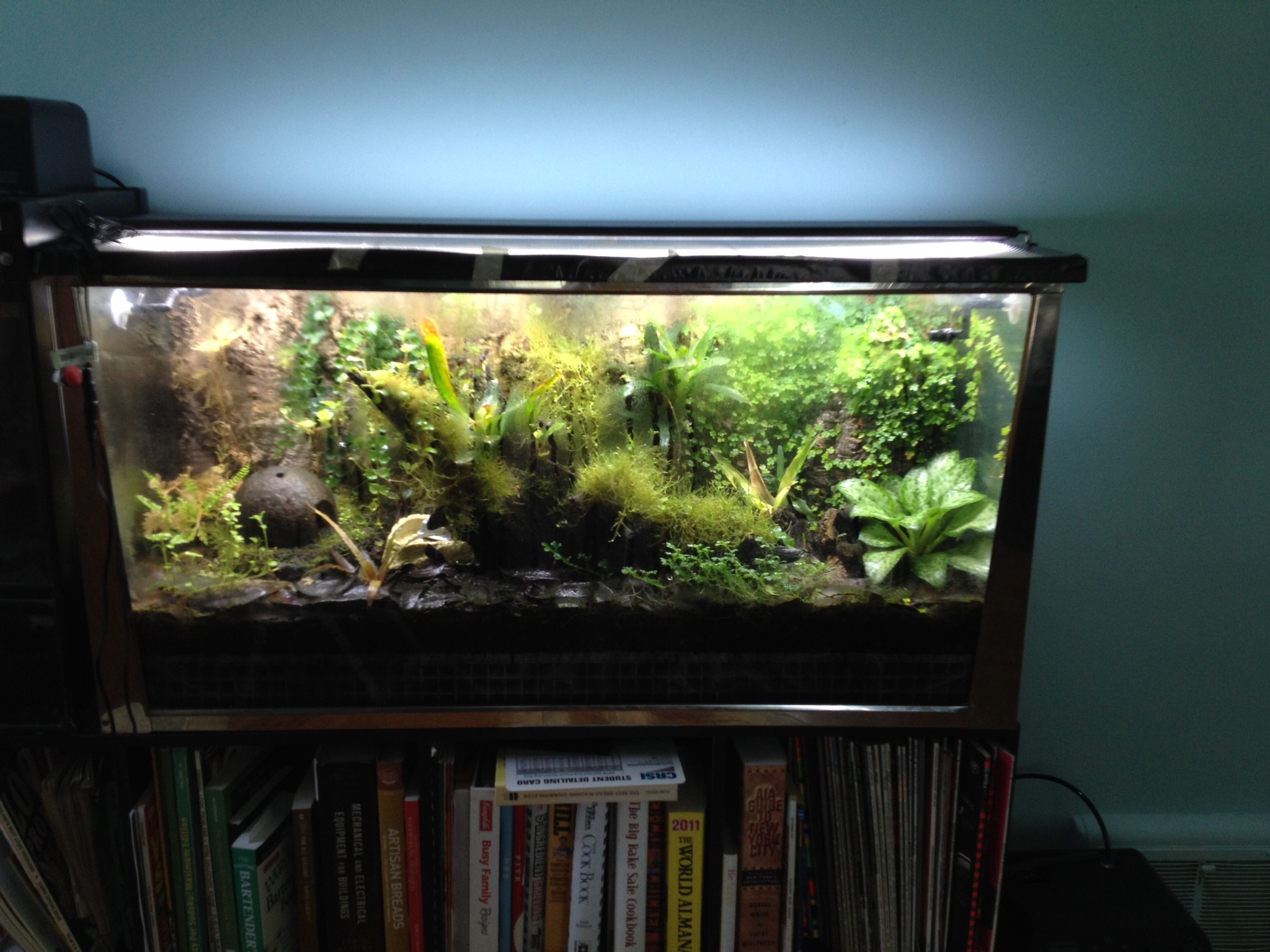 This tank is pretty cool. It is very well planted with lots of different moss, bromeliads, ferns & vines. The photo above shows that the tank does not have a black frame like the rest of my tanks. It is a vintage 1960’s aquarium with stainless steel frame.