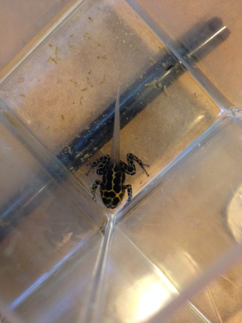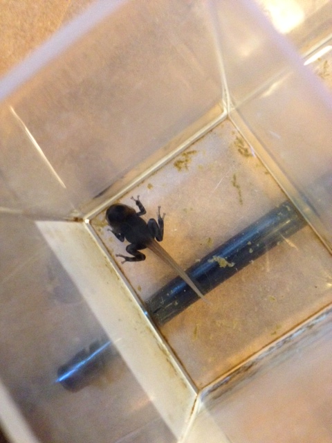 Well remember last week when I said that one tadpole was coloring up nicely while the other was being a slow-poke? Well, on Sunday the nicely colored tadpole popped his front legs and yesterday the slow-poke tadpole popped his front legs and he is still black! Under good light you can see that he is actually dark black with even darker black spots.