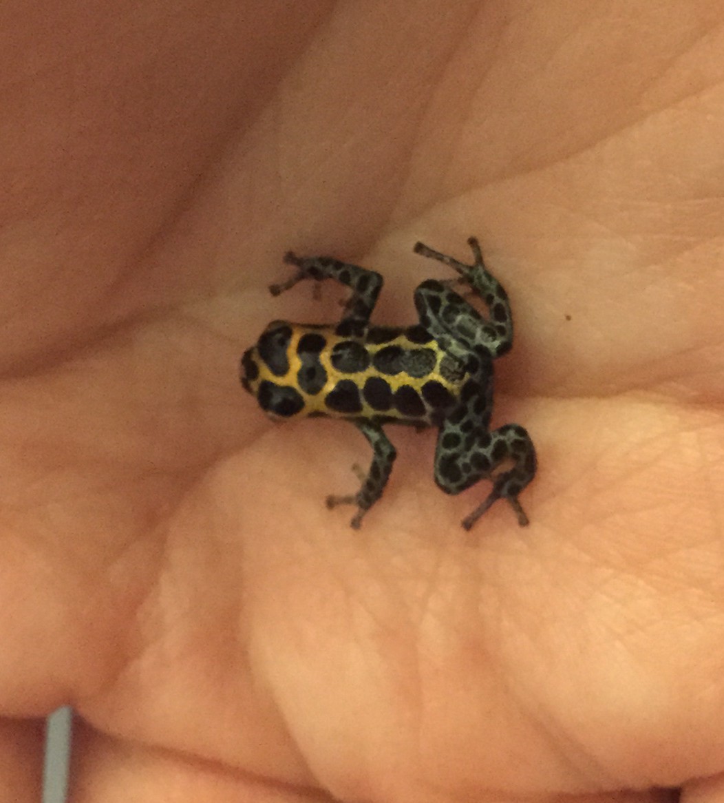 Hand –Make sure hands are clean! Carefully coax frogs to jump on hand by touching butt. This works well on larger frogs, but also little baby frogs.