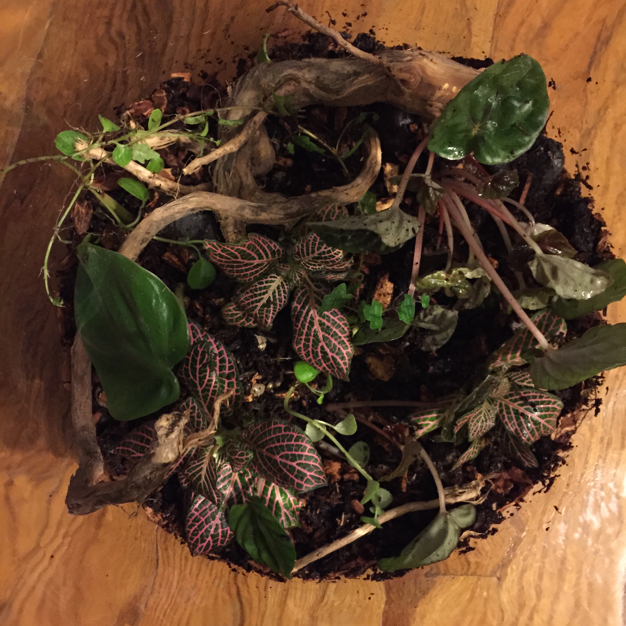 I added the Peperomia & Fittonia that my brother got me for Christmas, along with some creeping fig, Pilea & hardy small leaved philodendron from my plant tank. Any dwarf plant that likes high humidity plant should work. You can see what kind of plants I keep in my terrarium here.