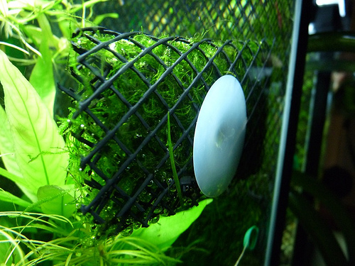 PL-MO03-06Obviously the photo above is in an aquarium, but the same technique applies to terrariums as well.  It sounds pretty easy to get set-up as well!  All you need to do is take some moss & sandwich it between 2 pieces of window screen and sew around the outside and a couple strips in the middle to keep the moss in place.  Make sure to add a suction cup or some way to attach it to the glass!  Once set-up make sure to mist it frequently and give it some good light until you can see it take off.  Below is what it looks like from behind.