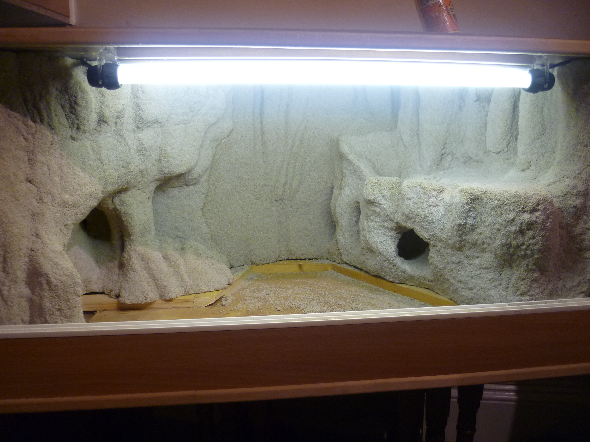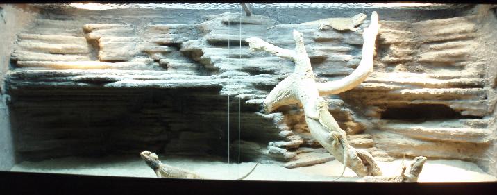 Now for dendroboard user Arkay’s tank.  This is the real reason that I kept with sand as the background material, because this tank is awesome!  It looks so real!  It was created with foam & great stuff covered in tile cement.  On the second coat of tile cement, it was tinted to get a more natural color.  Covered that in Minwax protective finish and sprinkled tinted sand while wet so it would stick.