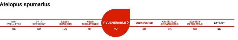 According to the IUCN Red List, the Atelopus are a vunerable species. Their major threats are forest loss due to agriculture, logging and clear cutting. This species is listed as vunerable due to the projected population decline, estimated at 30% over the next 10 years.