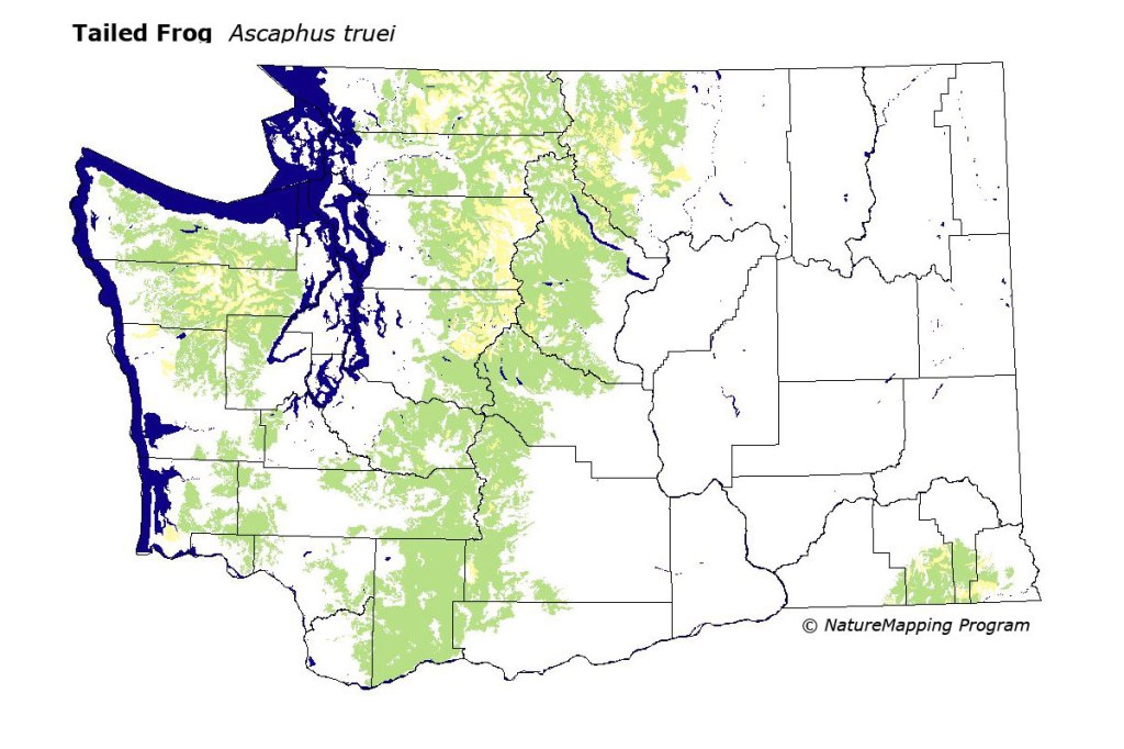 The coastal tailed frog’s skin color matches the rocks they live in and can be brown, gray, green, red or yellow. They have a dark colored eye stripe and a triangle on their nose. They are called the tailed frog as they have a tail which serves as their reproductive organ. They can be found from the Cascade mountains to the coast, in higher mountain elevations in SE Washington, has been separated into a separate species. They are rarely found a far distance from water. Unlike most frogs, the tailed frog has a granular rough skin.