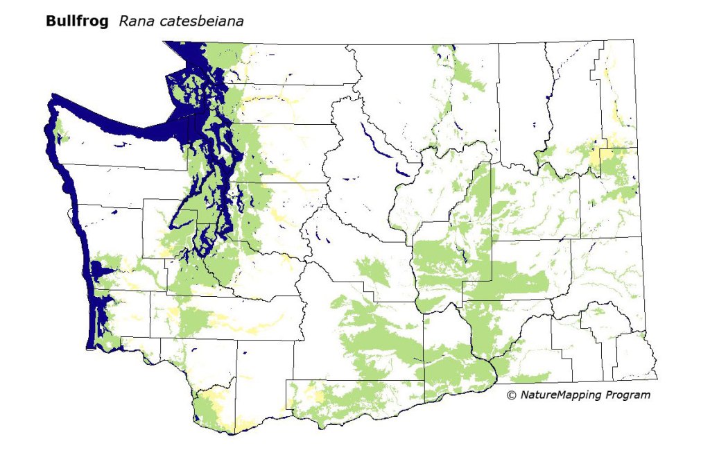 The American Bullfrog is the largest frog in North America. They can grow up to 8″ in length and weigh up to 1.5 pounds. The bullfrog is unique as it can be found in freshwater ponds, lakes and marshes throughout Canada, United States and as far south as Mexico and Cuba. They are typically green or gray-brown with brown spots. The American Bullfrog is an introduced species to Washington state and was originally only found to the east of the Rocky Mountains. They are currently found in many low elevation areas and live in lakes, ponds generally in the water or on the shoreline.
