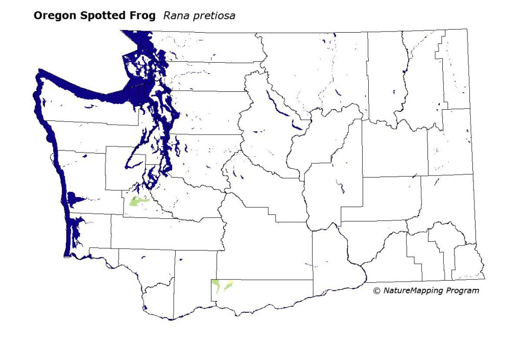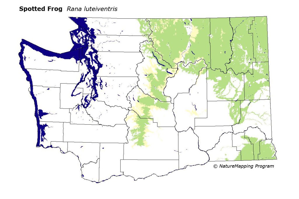 The Columbia Spotted frog has slightly bumpy skin that is smooth and moist. They are typically brown or olive color with irregular spots. They are known for their lower abdomen being bright salmon or a red color. This frog is high aquatic and can rarely be found far from a permanent water source. Below is the range of the columbia spotted frog. In Washington, they are found in the Cascades and in the eastern portion of the state.