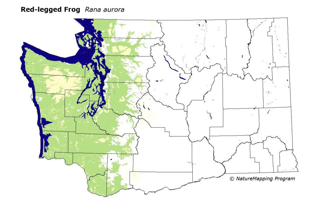These frogs are red to brownish coloring & can sometimes be found with black splotches and flecks of colors. The Northern Red Legged frog produces a call underwater which requires the female to be close to the calling male in order to hear it. When grabbed by predators, such as a garter snake, the Northern Red Legged frog will release a loud and startling scream. These frogs are typically found in humid forests, woodlands, grasslands and streamsides. They will breed in any permanent water sources such as lakes, ponds, slow streams and marshes. In Washington, they can be primarily found west of the Cascades Mountains.