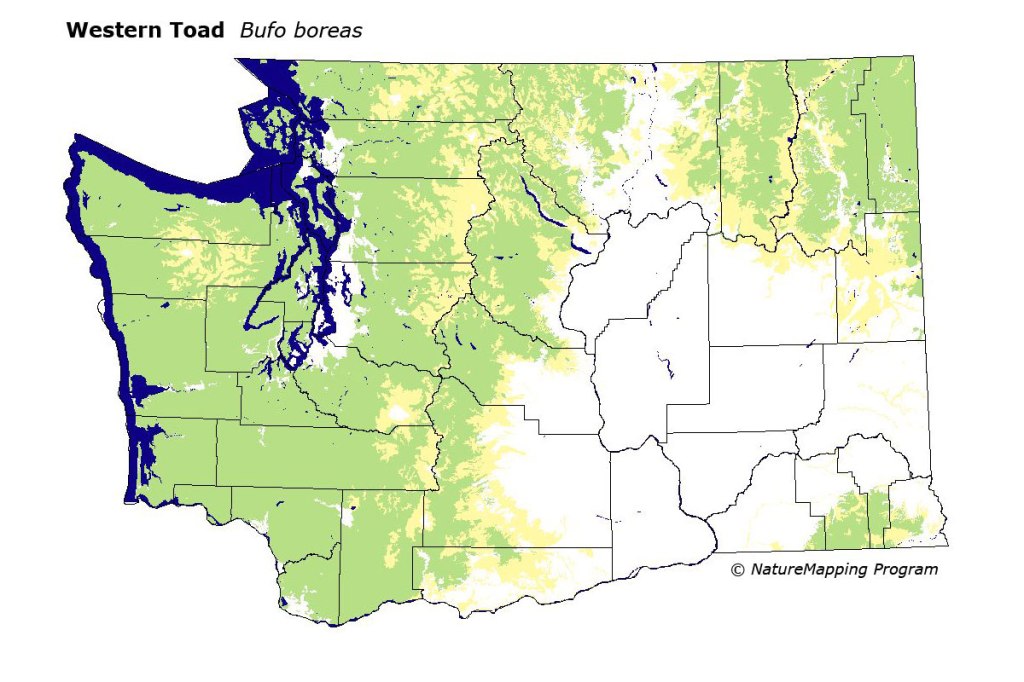 The western toad is chunky, with short legs and numerous warts (it is a toad after all). It can vary in color from gray, white, reddish broen, yelow or green with dark mottling on its tummy. There is a conspicuous light colored stripe running down the middle of its back. Their back feet have 2 large rubbery knobs on the heel which they use for digging shallow burrows or shelter under rocks and logs. The western toad is quite common and can be found across Washington except in the southeastern portion of the state.