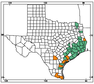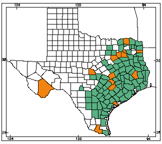 The Mexican treefrog is a large treefrog (up to 2-3/4″) with smooth green, gray, yellow or dark brown coloring. They typically have a light spot under eyes and near armpits and a dark line from their snout to their shoulder. During the day, it will typically be found under loose tree bark or in damp soil in sub-humid regions near streams. Within Texas, it can be found in the extreme southern tip of the state in Cameron and Hidalgo counties. It is considered a threatened species by the Texas Parks and Wildlife Department so it is fully protected by the state.