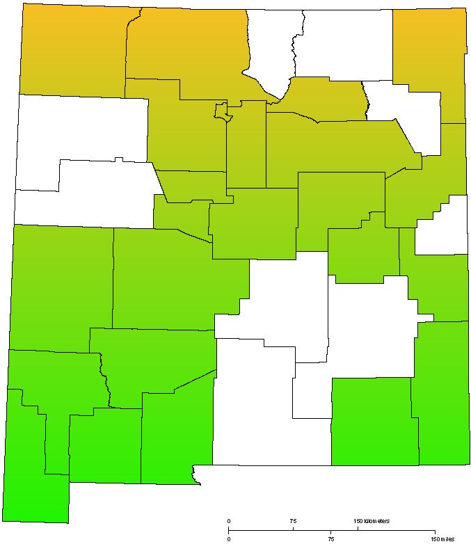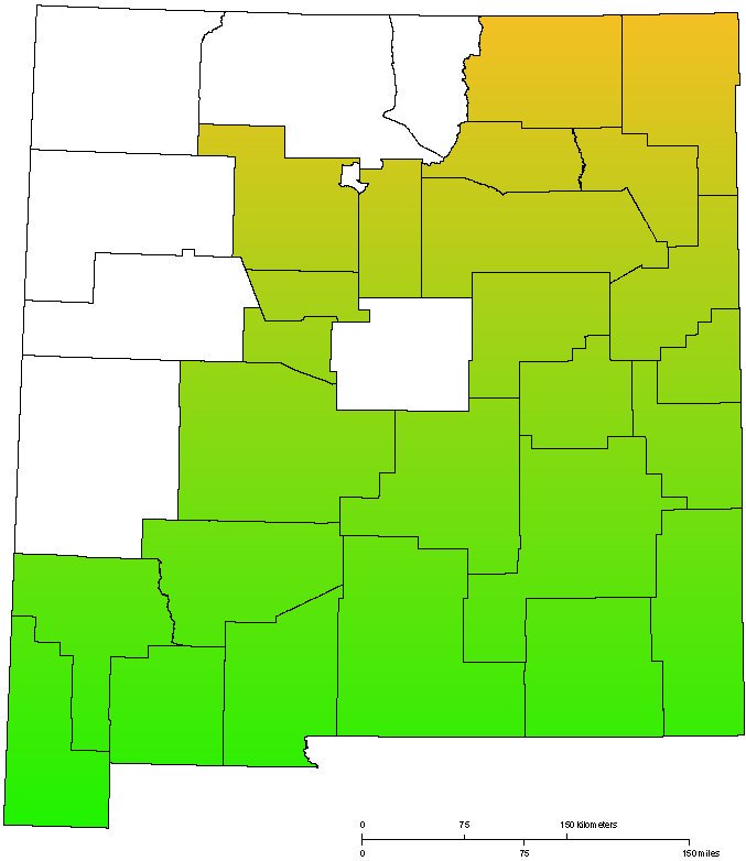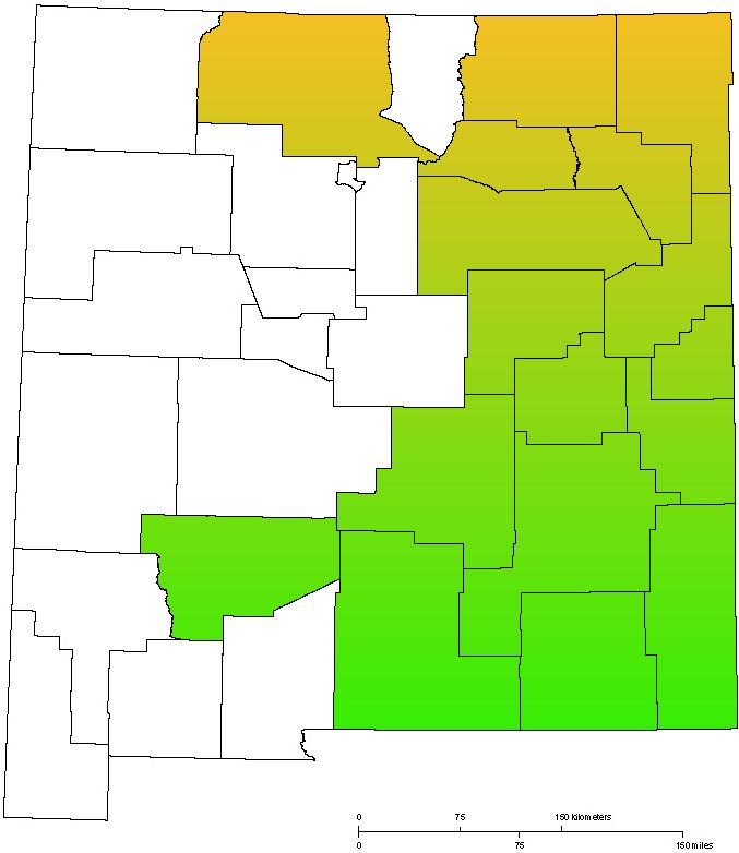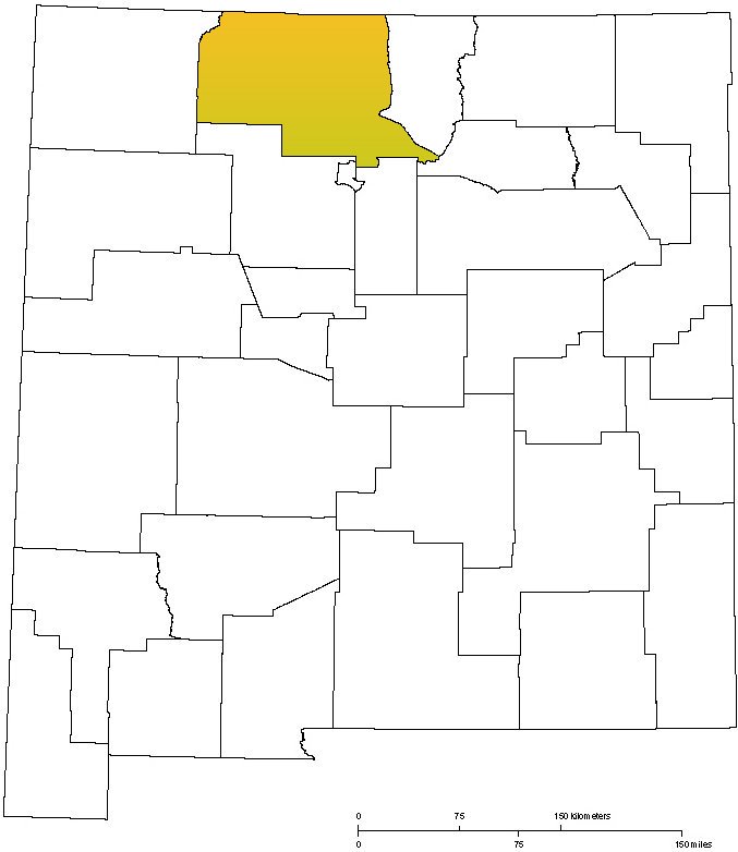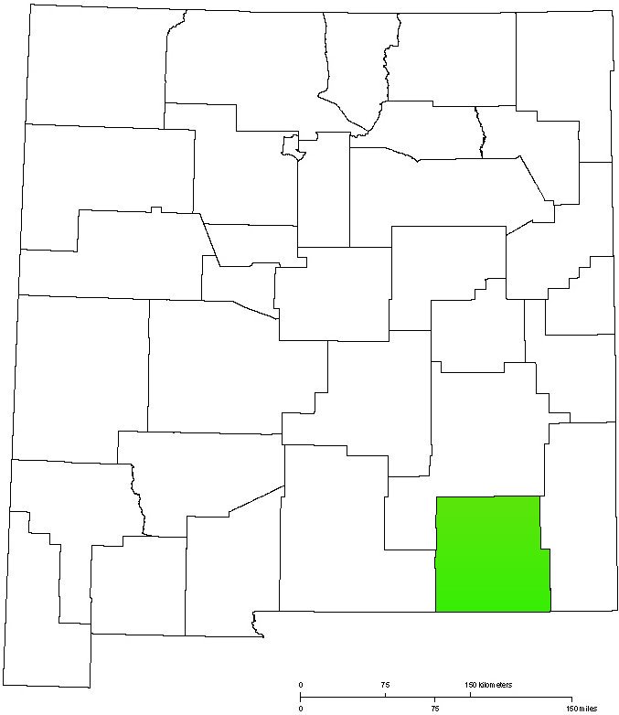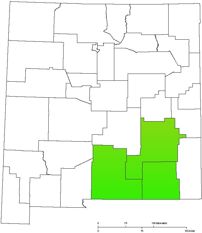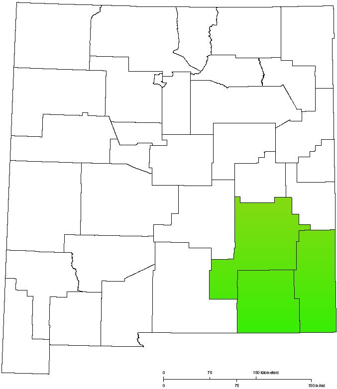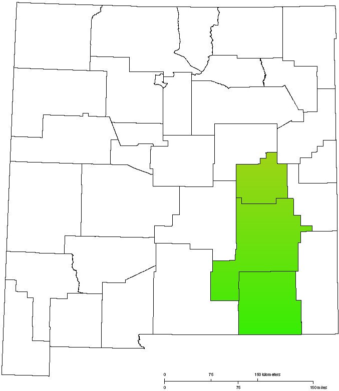 The red-spotted toad is unique due to its gray or brown coloring and red/orange warts. They can reach 3″ in length and can be found in rocky canyons and streams or burrowing under rocks. Typically found across New Mexico except for the scattered counties shown below.