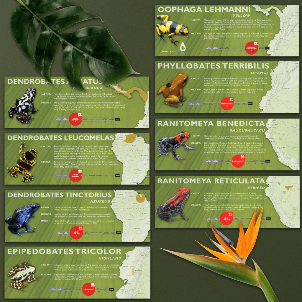 The early concepts were all over the place, and the form factor at the time was very photo sized (6″ long x 4″ tall). After some discussion with early potential customers I settled on a design that featured a green tropical leaf background and included a map, photo of the frog, IUCN Red List status, and habitat and breeding information. I believe Brian Burris was the first person to suggest the current form factor (7″ long x 2.5″ tall), it really works on just about any size tank. The basic design has remained pretty much the same. This year I overhauled the design aspects of the basic label and just made it look a lot nicer than it used to.