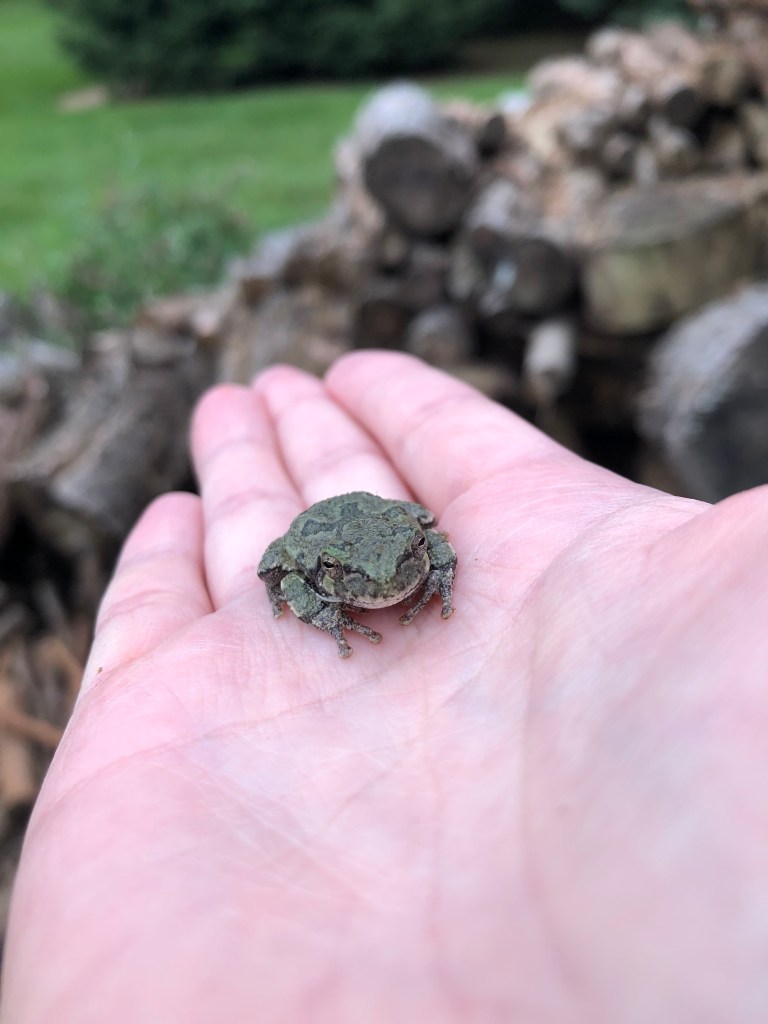 I’m a brand new frogger! Wonder if this little guy (found up on my deck cozy in the webbing if a folding chair!) might be a grey tree frog? I put him down on my scrap wood pile – his color quickly faded to match those of the logs…